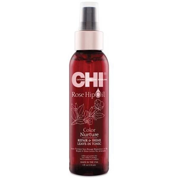 CHI Rose Hip Oil Repair & Shine Leave-In TonicCHI Rose Hip Oil Repair & Shine Leave-In Tonic is een leave-in conditioner die het geverfde haar herstelt, handelbaar en pluisvrij maakt. De leave-in tonic beschermt de haarkleur, bestrijdt pluis, geeft glans en hydrateerd. Zeer geschikt voor geverfd haar.Het haar krijgt zijn kracht terug, dit resulteert in een prachtige glans en gezond haar. De leave-in tonic heeft een aangename geur en is zuinig in gebruik.CHI Rose Hip Oil Repair & Shine Leave-In Tonic: