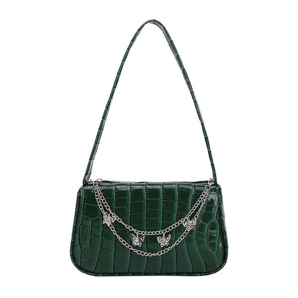 Deze stijlvolle draagtas is volledig gemaakt van duurzame materialen. De kleine tas heeft één grote vakverdeling in het midden die kan worden afgesloten met de speciale dubbele ritssluiting. Aan de ritsen zit een mooie ketting met decoratieve vlinders.