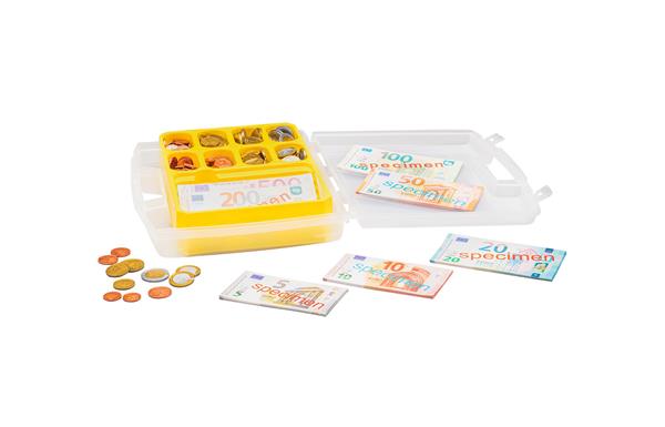 Geldkoffer met 160 munten en 130 biljetten. Ideaal om te gebruiken ter ondersteuning bij de rekenlessen over geld of om mee te spelen in je winkeltje thuis of in de klas. De kinderen leren het juiste bedrag betalen en teruggeven met dit concreet en realistisch materiaal.