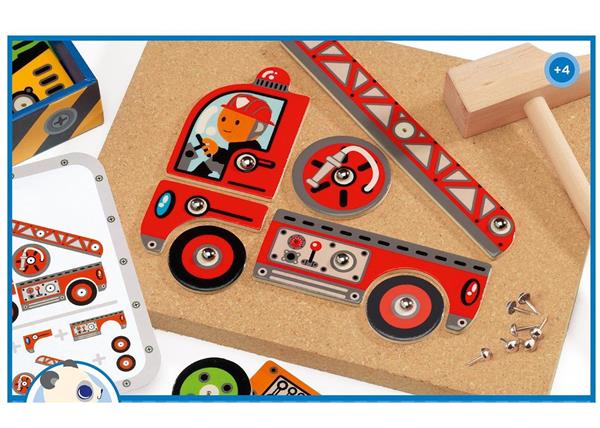 Met dit spelbord kunnen kinderen hun eigen auto's en vrachtwagens bouwen door met de hamer en spijkers de houten vormen aan het spelbord te bevestigen. Ze kunnen de meegeleverde voorbeeldkaarten namaken of een eigen creatie maken. Alle vormen zijn mooi geïllustreerd in het thema 'voertuigen'. Na het spelen kan alles worden opgeborgen in een mooie houten doos. Uiteraard wordt hier ook de fijne motoriek gestimuleerd.