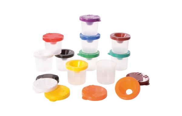 Set van 10 knoeipotjes van stevige kunststof. Elke pot heeft een conisch binnendeksel dat morsen voorkomt als de pot omvalt. Ze zijn volledig afsluitbaar met het buitendeksel om de resterende verf luchtdicht op te bergen. Er past ongeveer 250 ml in 1 knoeipot.