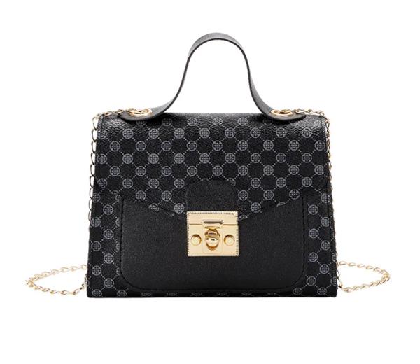 Deze stijlvolle kleine handtas is gemaakt van synthetisch leer met polyester voeringmateriaal en heeft een mooi contrasterend patroonontwerp met een prachtige gouden ketting en sluiting.