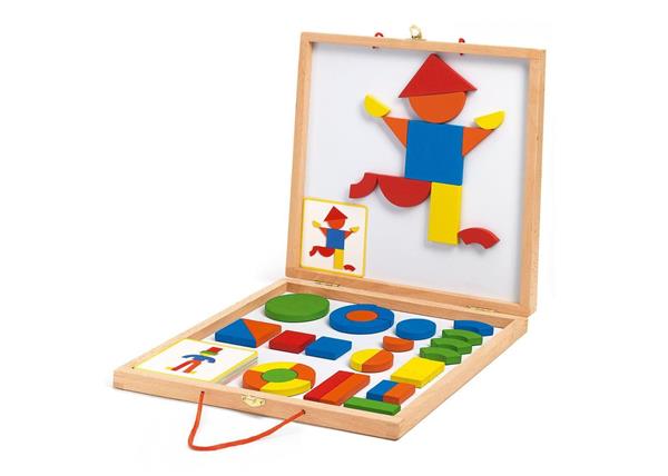 Een prachtige houten draagtas met magnetische vormen voor het creëren van allerlei figuren zoals dieren, voertuigen, personen,... . Open de koffer en plaats de vormen op het magnetisch veld van de koffer. Laat kinderen hun fantasie de vrije loop terwijl ze eindeloos verschillende creaties maken. Door de sluiting en het handvat neem je het makkelijk mee voor onderweg. Perfect voor op reis en lange autoritten.
